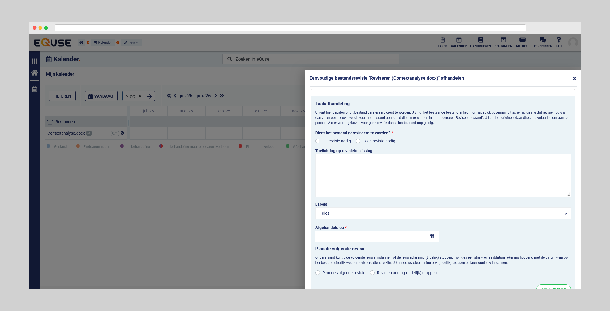 De taakafhandelingsschermen voor Bestanden en Handboek zijn verduidelijkt en beter op elkaar afgestemd, zodat u sneller begrijpt welke beslissing u neemt en op welk moment. U ziet duidelijker wat een revisiebeslissing inhoudt en wanneer een taak gepland staat, waardoor het risico op onbedoeld te vroeg afhandelen wordt verkleind. Daarnaast kunt u eenvoudiger de huidige versie van een bestand downloaden en is het mogelijk om bij handboekpaginarevisies, revisievoorstellen met elkaar vergelijken, ook wanneer meerdere collega’s aan een voorstel werken.