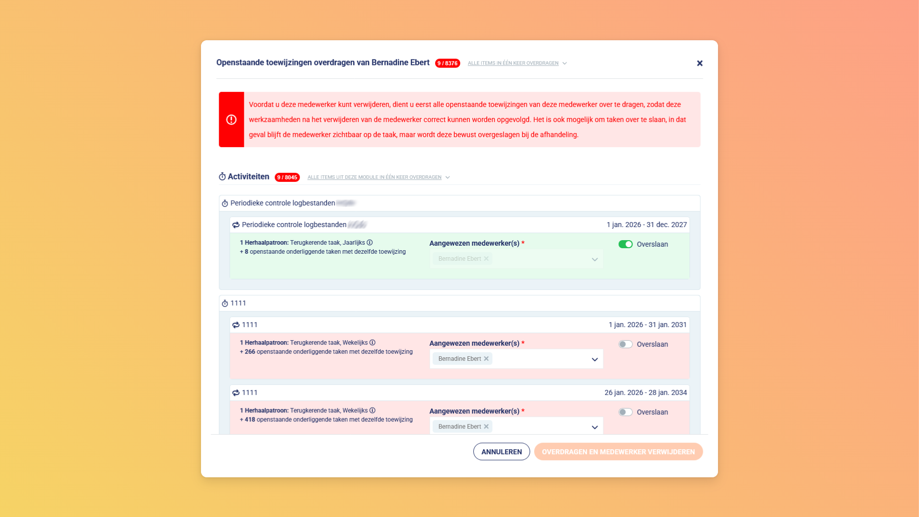 - Mogelijkheid om bij het overdragen van toewijzingen, specifieke toewijzingen over te slaan voor meer regie over de verdeling en continuïteit van werkzaamheden.