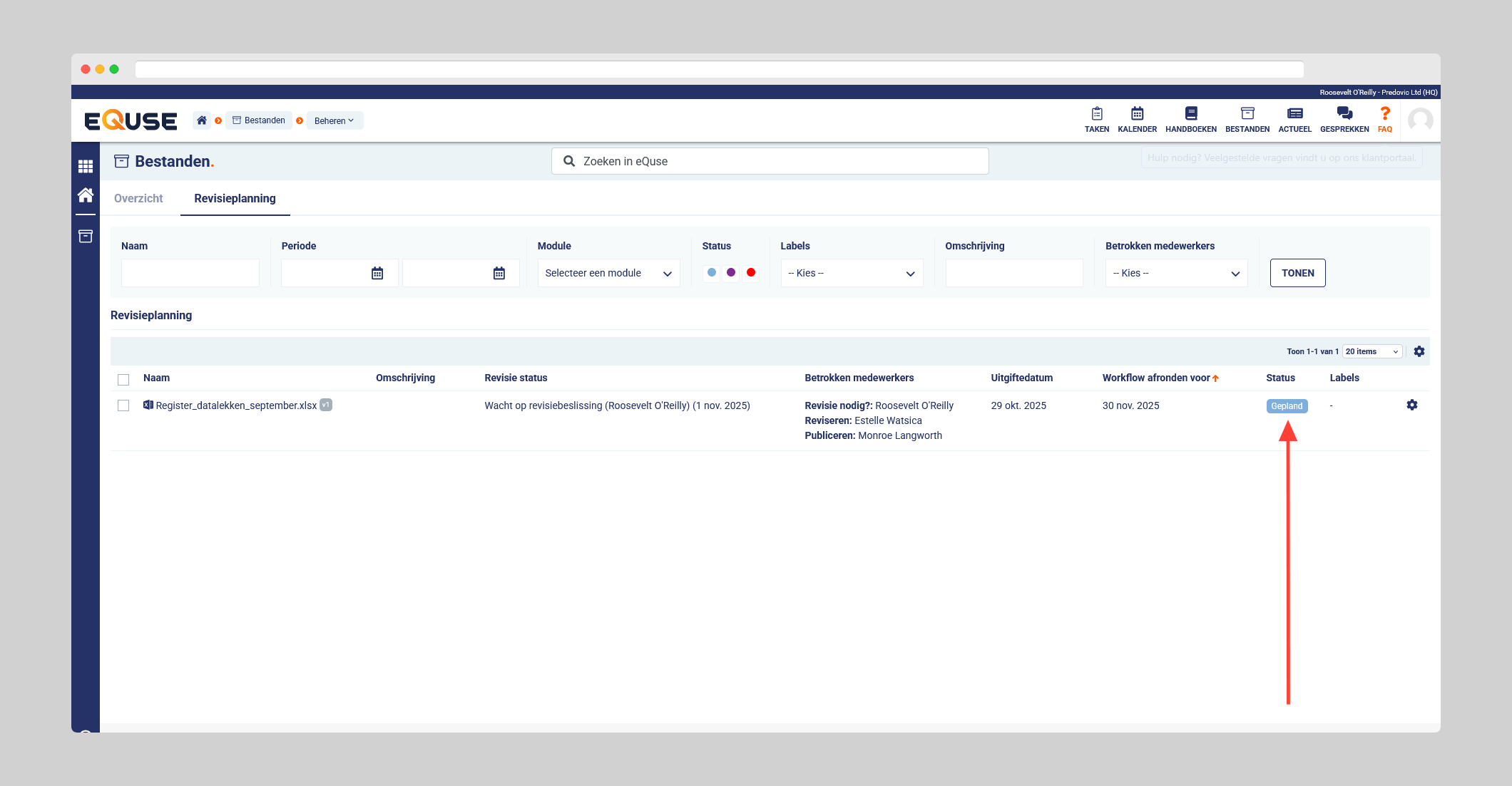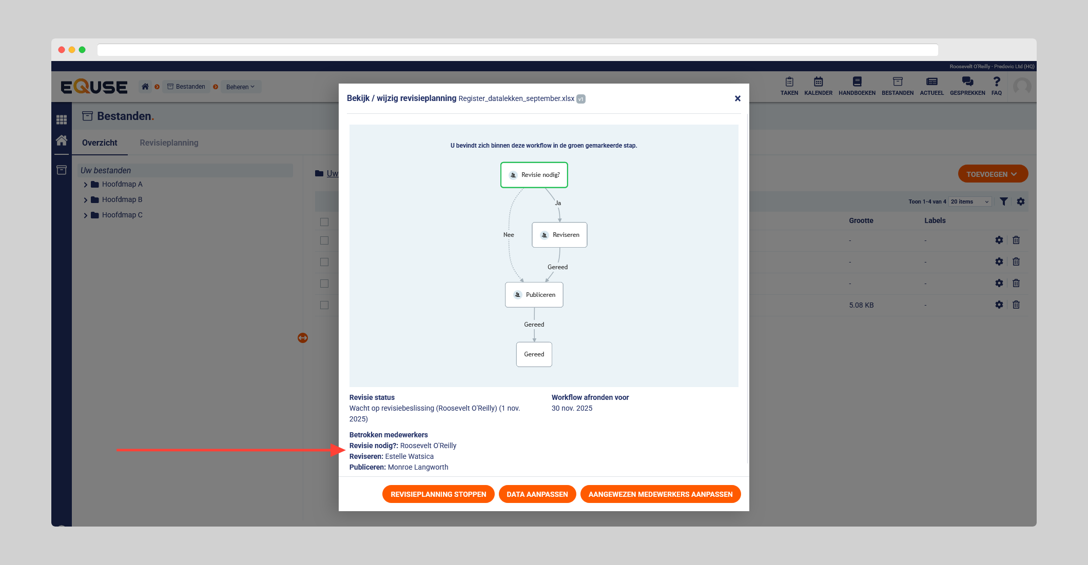 - Op de bekijkpagina van de revisieplanning (voor zowel bestanden als handboekpagina’s) worden nu ook de toegewezen medewerkers weergegeven, waardoor u in één oogopslag ziet wie waarvoor verantwoordelijk is.