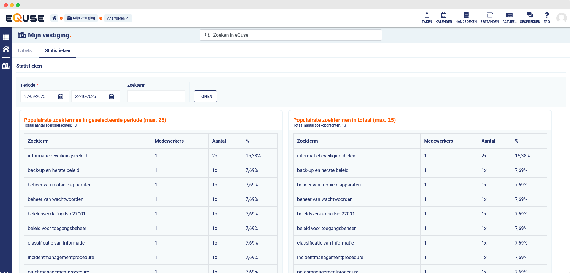 Met het nieuwe tabblad “Statistieken” in de werkomgeving "Analyseren" van de module “Mijn Vestiging” krijgt u helder inzicht in de meest gebruikte zoektermen binnen uw vestiging. U ziet (anoniem) welke woorden het vaakst worden ingevoerd — zowel over een specifieke periode als over de gehele tijd — inclusief aantallen en percentages. Deze informatie helpt u beter te begrijpen waar medewerkers naar op zoek zijn, zodat u uw aanbod of informatievoorziening gerichter kunt verbeteren. Zo maakt u het voor uw medewerkers eenvoudiger om te vinden wat zij zoeken.