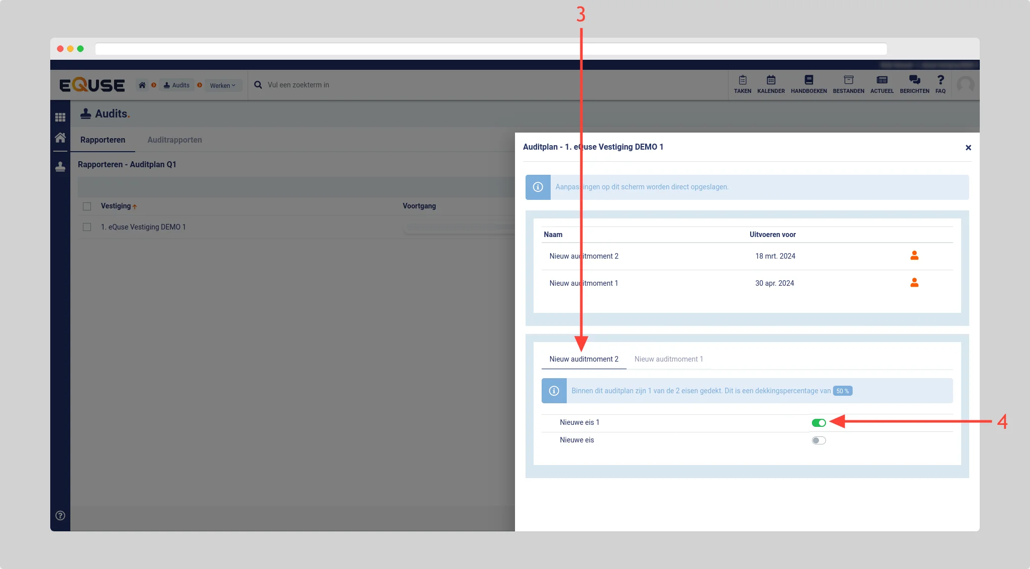Klik onderaan het paneel op de naam van een auditmoment (3) en klik in de lijst met eisen op de eisen die u wilt toevoegen door deze te activeren (4).