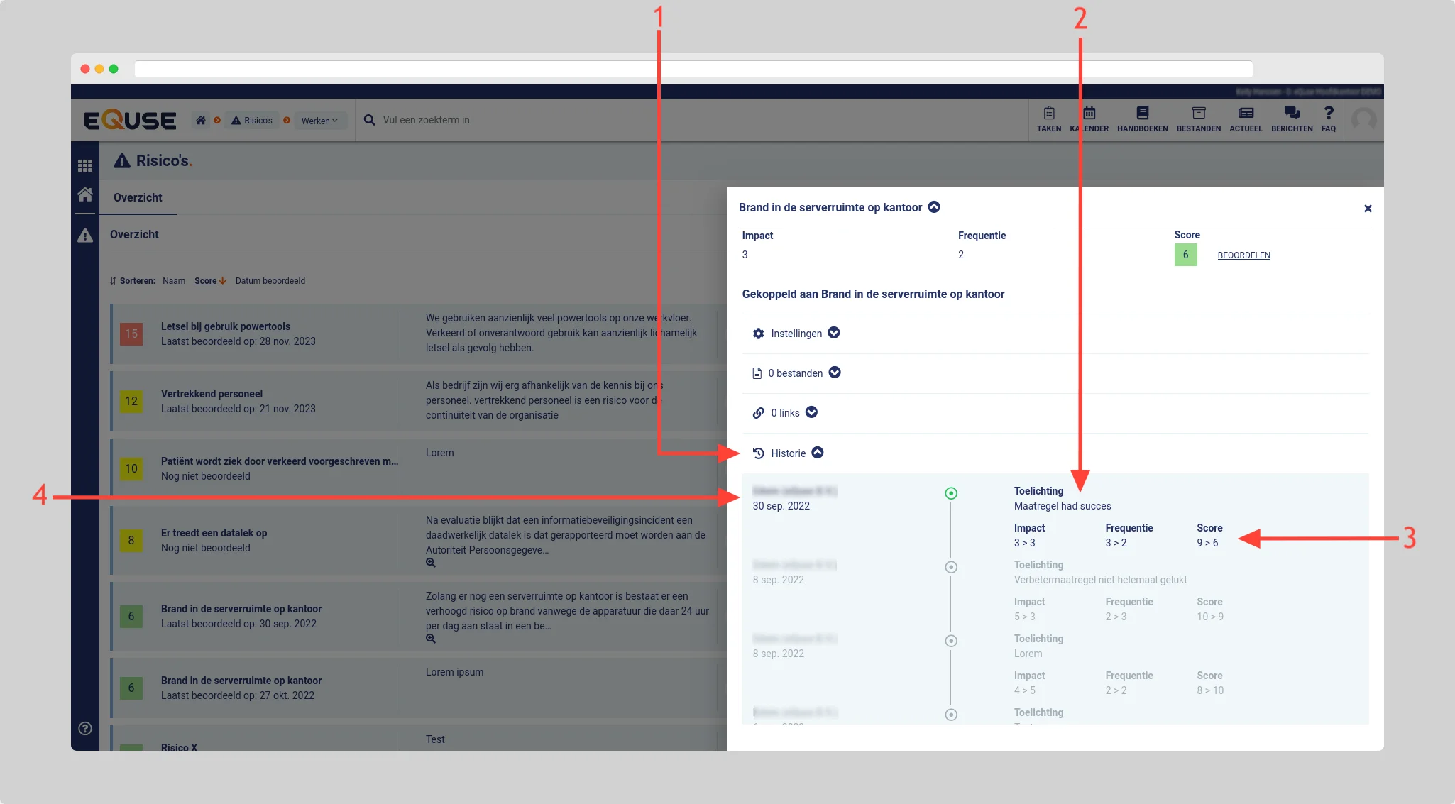 Ga naar Risico's > Werken > Overzicht en klik op het risico waarvoor u de beoordeel historie wilt bekijken. Klik vervolgens in het zijpaneel op historie (1) om de toelichting (2) en de aangepaste impact, frequentie en score (van > naar) (3) bij iedere beoordeling (4) te bekijken.
