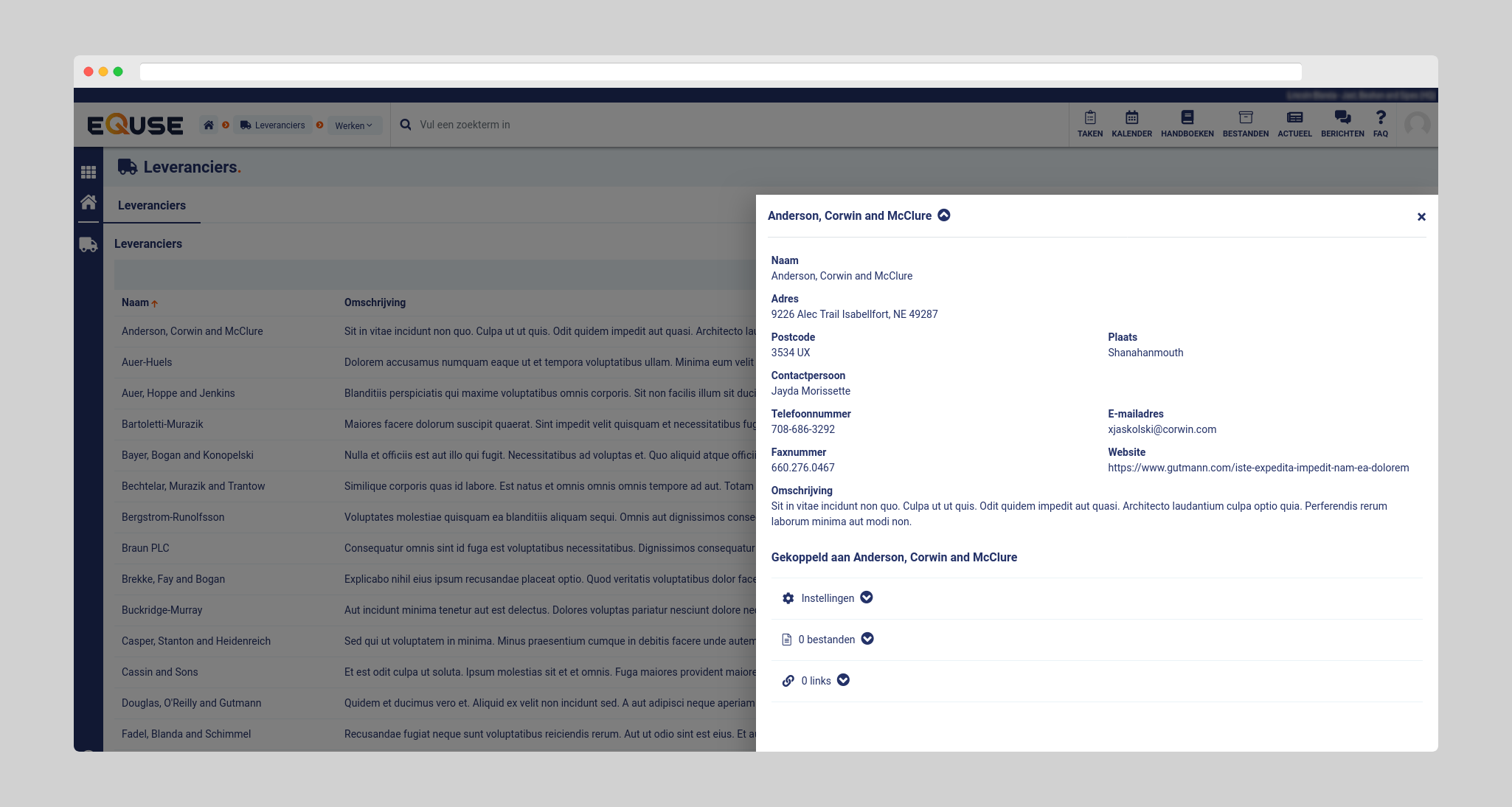 U kunt leveranciersgegevens bekijken via Leveranciers > Werken > Leveranciers. Wanneer u op de naam van een leverancier klikt, zullen de leveranciersgegevens worden weergegeven in het zijpaneel.