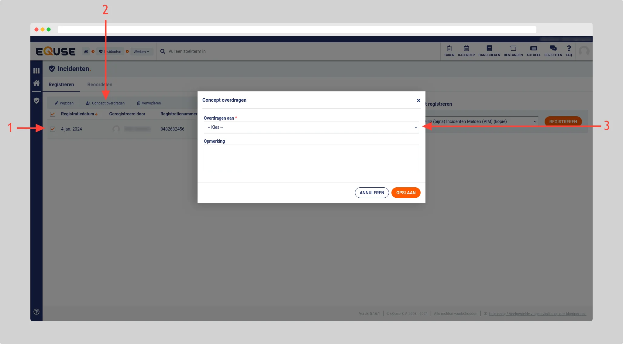 - Selecteer de conceptregistratie die u wilt overdragen door het selectievakje aan te klikken (1) of klik op het tandwiel icoontje.
