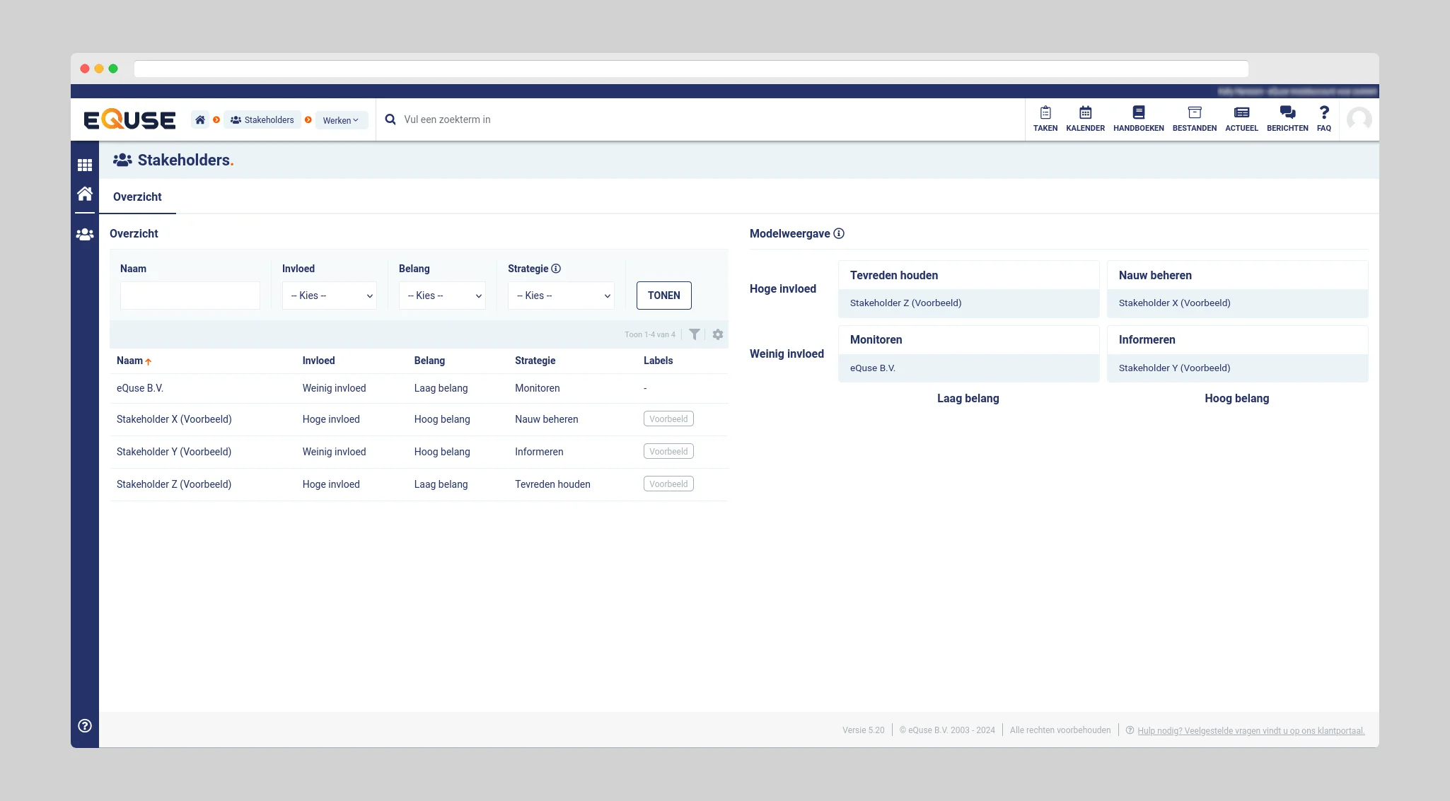 U kunt de dominantiematrix bekijken via Stakeholders > Werken > Overzicht.