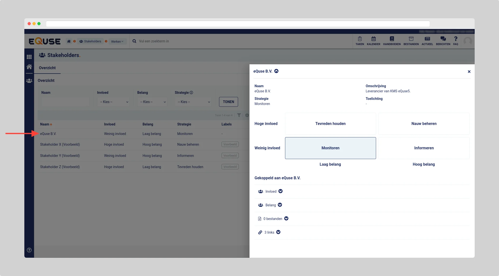In de dominantiematrix kunt u zien in welk quadrant uw stakeholders zijn ingedeeld. Door te klikken op de naam van een stakeholder kunt u de gegevens van deze stakeholder inzien.
